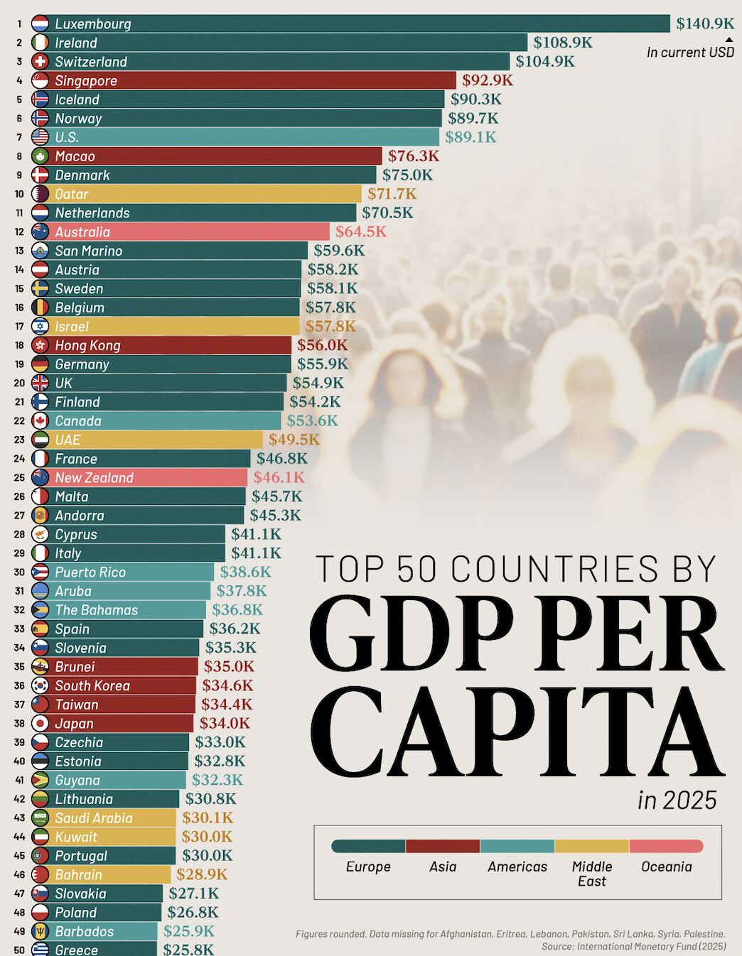 👉 Nous classons les 50 premiers pays en fonction de leur PIB par habitant en 2025, à partir des chiffres du Fonds monétaire international (FMI).